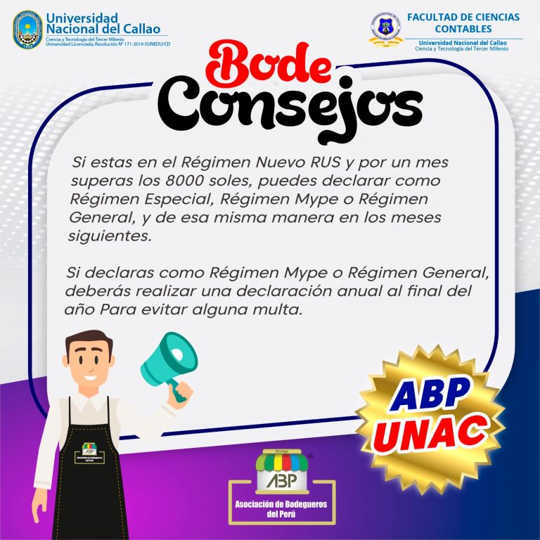 BodeConsejos ABP🔍💪 Si perteneces el Régimen Nuevo Rus y por un mes superas los 8000 soles, puedes declarar en otro régimen. 🤓 #Bodeconsejos #BodeguerosUnidos #ABPOficial #ABP #AsociacionOficialDeLasBodegasDelPeru #TrabajandoPorLasBodegasDelPeru #UnidosPorUnaSolaAsociacion #YoSoyBodegaResponsable