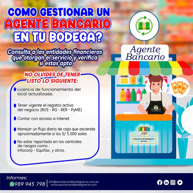 ¡Amigo Empresario Bodeguero! Así puedes gestionar un agente bancario en tu bodega, consulta a las entidades financieras que otorgan el servicio y verifica si estas apto para hacer crecer tu negocio. #BodeguerosUnidos #ABPOficial #ABP #AsociacionOficialDeLasBodegasDelPeru #TrabajandoPorLasBodegasDelPeru #UnidosPorUnaSolaAsociacion #YoSoyBodegaResponsable