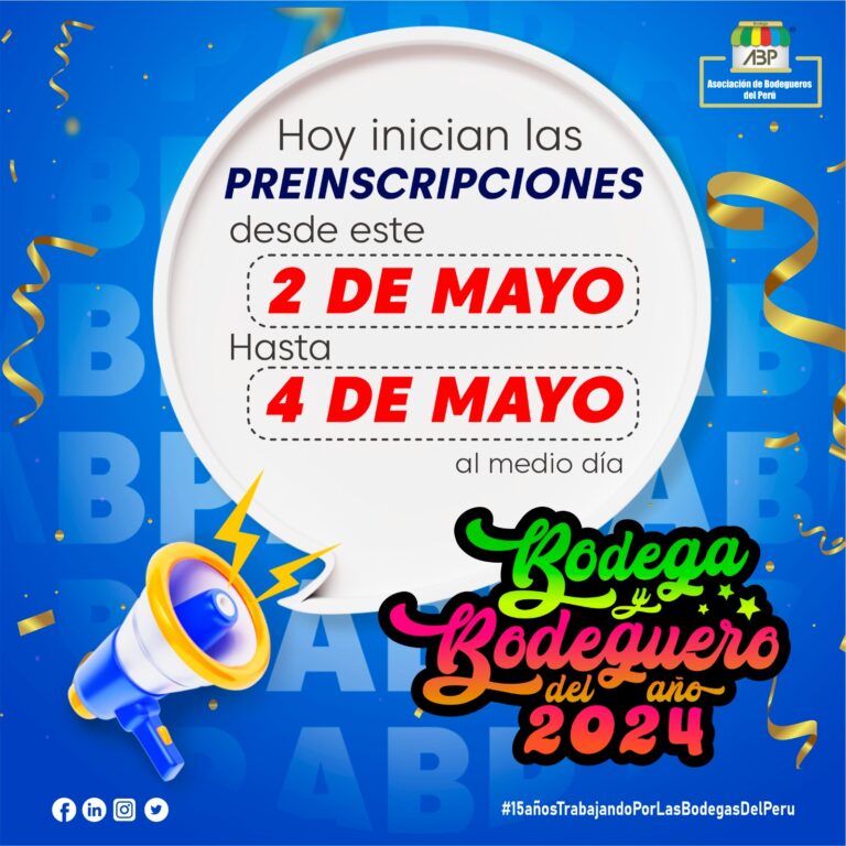 🚨 ¡HOY INICIARON LAS PREINSCRIPCIONES para ‘Bodega y Bodeguero del año 2024! 📣 🗓 Desde hoy 2 de mayo hasta el 4 de mayo a las 12:00 del mediodia 📲 WHATSAPP (+51) 989 945 798 💻 CORREO: Info@asociaciondebodegueros.com.pe * Los socios que lleguen a preinscribirse tendrán una charla vía Zoom en la cual se les…