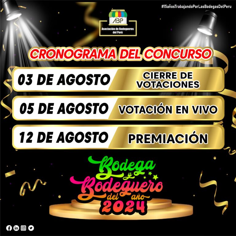 ¡Cronograma del concurso Miss Bodeguera Perú! Cierre de votaciones: 29 de julio. Anuncio de las 5 finalistas: 31 de julio. Premiación: 12 de agosto en el evento del día del Bodeguero. #MissBodegueraPeru #Miss #ABPOficial #ABP #AsociacionOficialDeLasBodegasDelPeru #TrabajandoPorLasBodegasDelPeru #UnidosPorUnaSolaAsociacion #YoSoyBodegaResponsable
