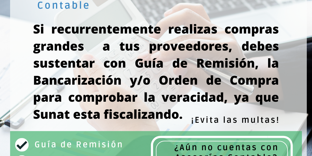 Si recurrentemente realizas compras grandes a tus proveedores, debes sustentar con Guía de Remisión, la Bancarización y/o Orden de Compra para comprobar la veracidad, ya que Sunat esta fiscalizando.