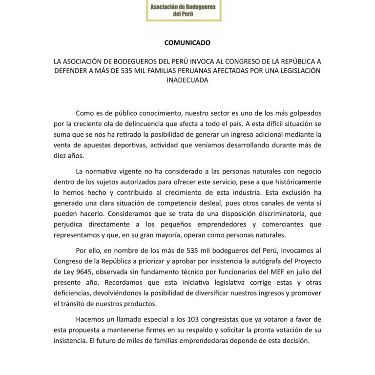 📢 COMUNICADO ABP La Asociación de Bodegueros del Perú invoca al Congreso a defender a más de 535 mil familias bodegueras afectadas por la actual normativa que excluye a las personas naturales de la venta de apuestas deportivas, dejándonos sin una fuente de ingreso que hemos desarrollado por más de 10 años. Esta medida genera…