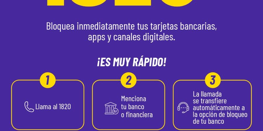Te presentamos 1820, 📞 una línea de emergencia que te conectará con tu banco para realizar el bloqueo de tus tarjetas, billeteras digitales y apps financieras rápidamente. 💸